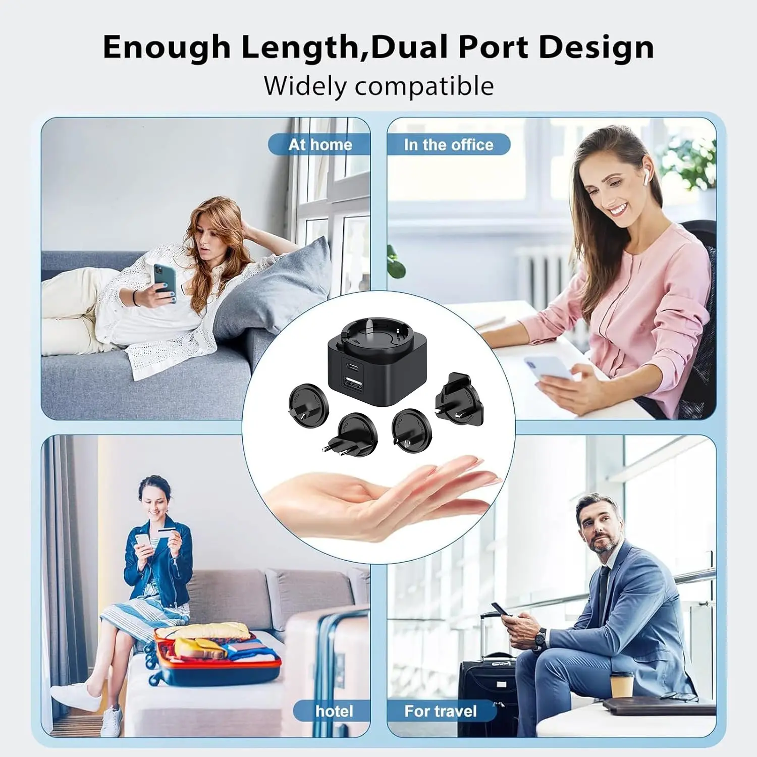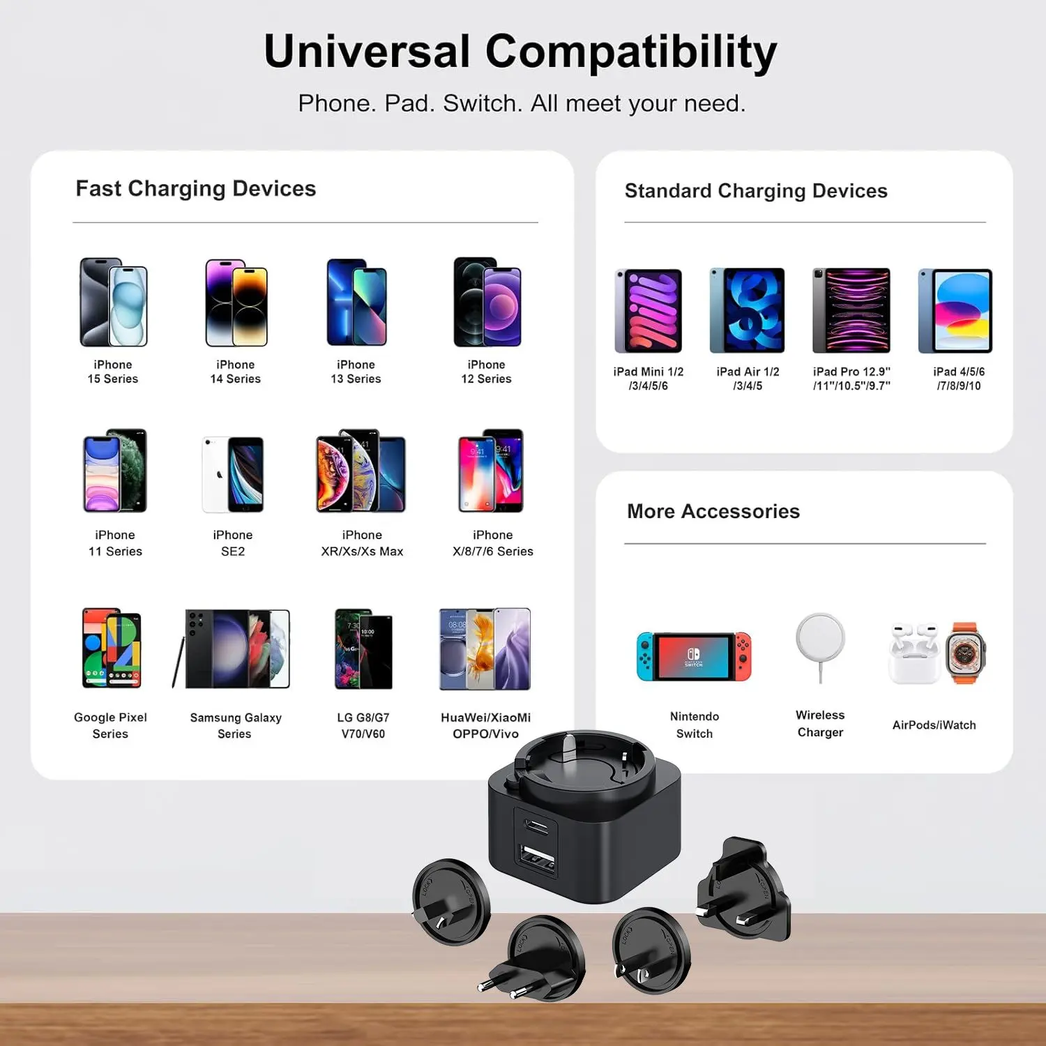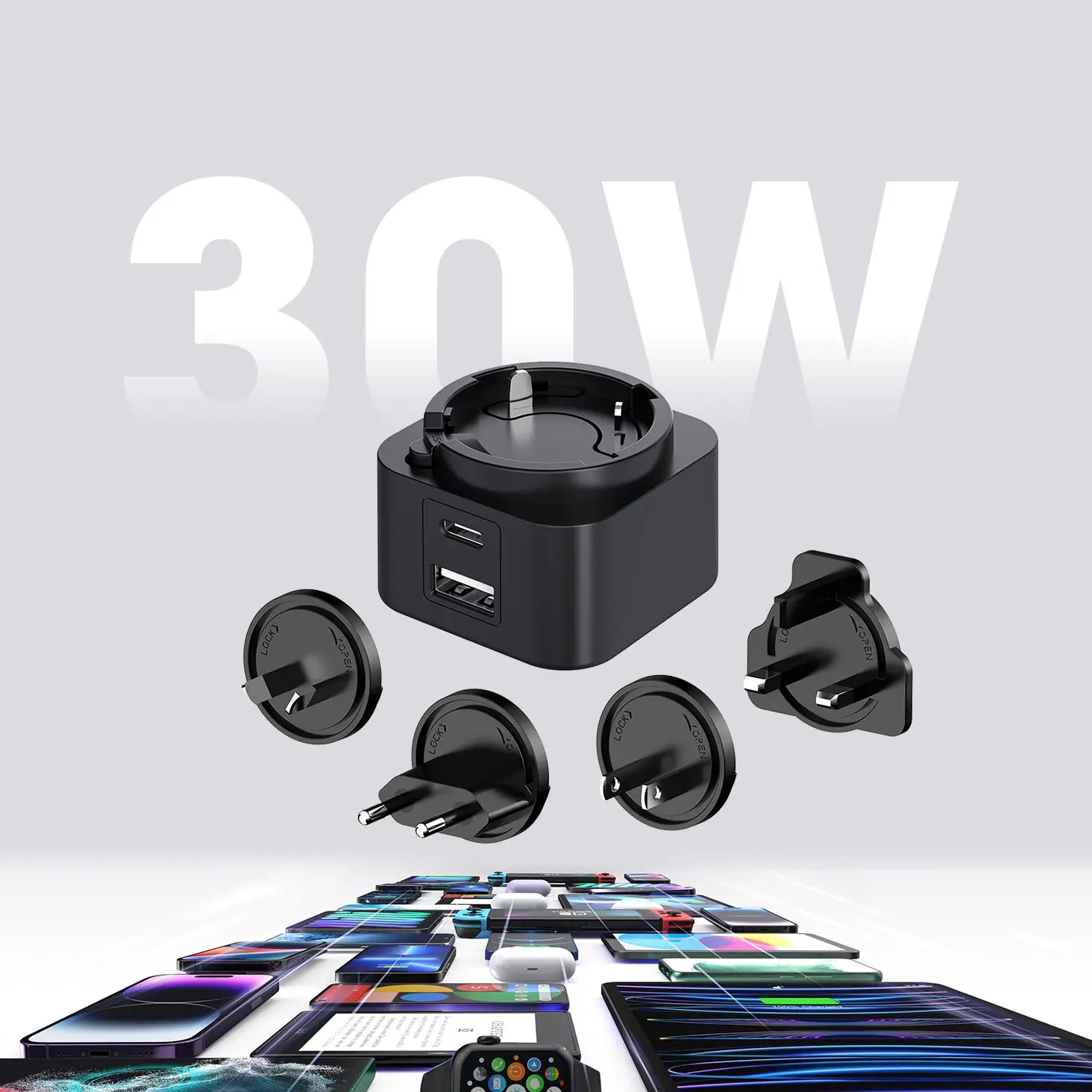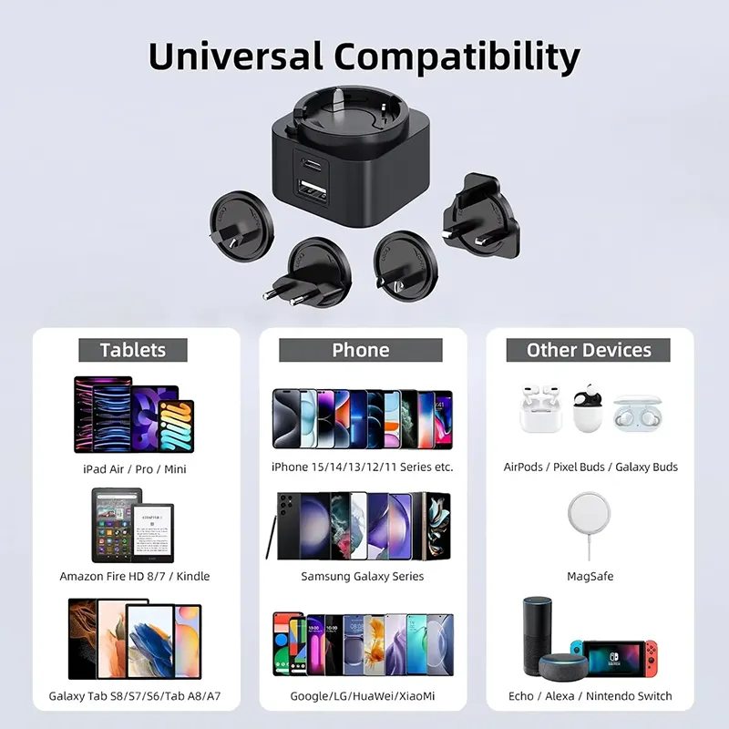 Tá solúbthacht ríthábhachtach. Ligeann an dearadh déphoirt (USB-C/USB-A) duit dhá fheiste a luchtú ag an am céanna. Tá sraith de phlocóidí idirmhalartaithe (SAM/AE/RA/AU) ag baint le Charger PD Breiseán Idirmhalartaithe 30W, rud a fhágann gur compánach taistil foirfe é ar fud na cruinne. Cibé an bhfuil tú ag muirearú ar fhón cliste, táibléad nó ríomhaire glúine, cinntíonn comhoiriúnacht uilíoch feidhmíocht barrleibhéil.