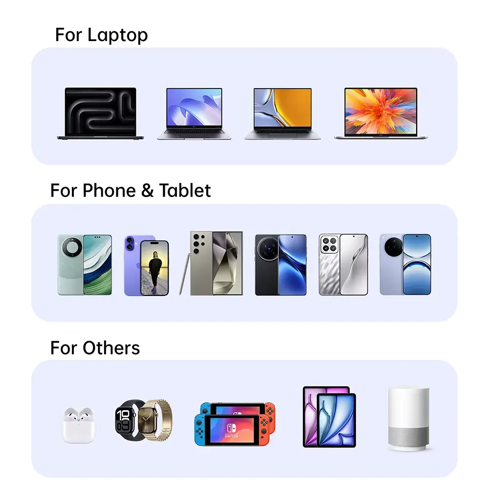 Ag luí le feistí USB-C, lena n-áirítear fóin phóca, cluasáin, agus gabhálais cearrbhachais. Aimsítear go huathoibríoch riachtanais gléas le haghaidh muirearú sábháilte agus éifeachtach. Inaistritheacht 4.Travel-Ready