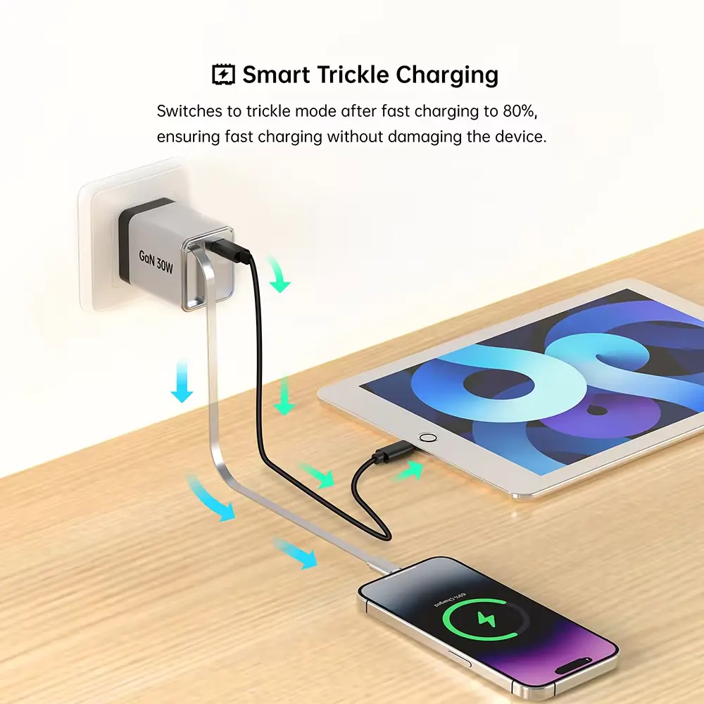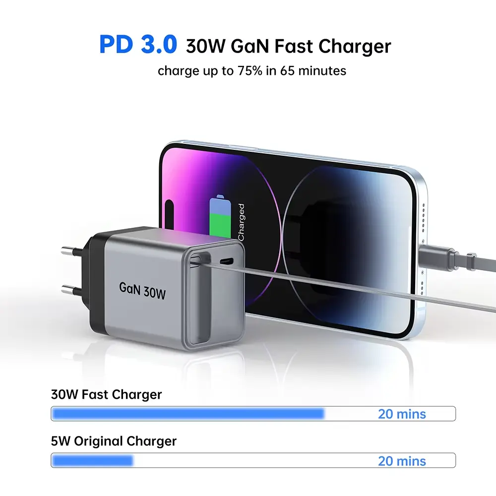 Charger Tapa 30W le Cábla Cineál C in-aistarraingthe Déanann dearadh póca-éadrom, meánmhéide ultra-éadrom, go bhfuil sé éasca é a iompar timpeall. Is é an rogha iontach é don bhaile, don oifig nó don taisteal.
